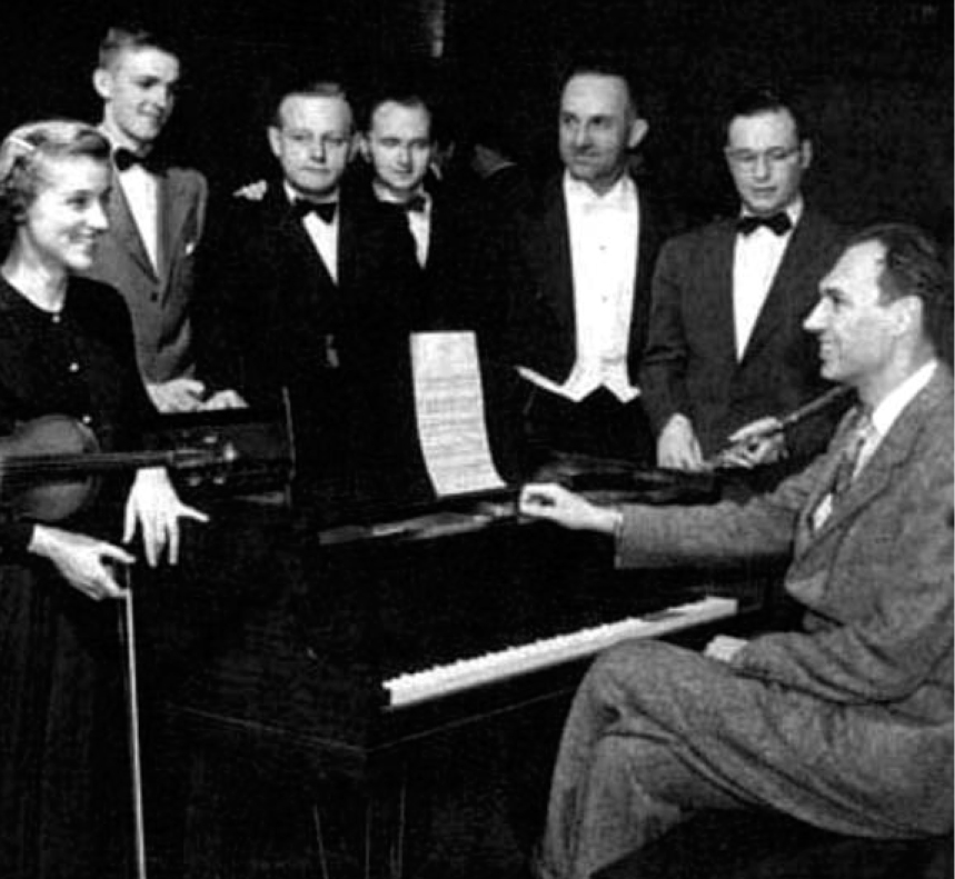 Art was a serious composer whose Overture for the Dedication of a Nuclear Reactor was performed by the Oak Ridge Symphony Orchestra in 1955 and broadcast nationally. The photo at left shows Art seated at the piano, surrounded by some of the orchestra members. This photo was published in Earl Dumour’s article “An Interview with Arthur Roberts” in the Summer 1993 issue of the Computer Music Journal (pages 17–22). Art also wrote a serious science fiction opera and translated Offenbach operettas. But he was perhaps best known throughout the physics community for his lighthearted and clever songs about physics. For example, to commemorate the awarding of the Nobel Prize to I. I. Rabi, associate director of the MIT Radiation Laboratory, the lab held a party, the highlight of which was Art’s “Rabi Song.” Art also composed other songs, many for his wife, Janice, to sing, including “Female Physicist” and “Lament of the Faculty Wife.” He wrote about his songs in a November 1948 article published in Physics Today, (page 17