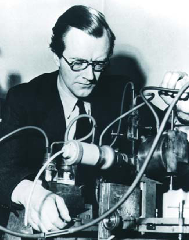 Wilkins enjoyed working in the laboratory, even the time-consuming and painstaking process of drawing well-oriented DNA fibers. The accompanying photograph shows him with an x-ray generator, x-ray cameras, and camera mounts. He designed the cameras, with their 100-μm adjustable collimators, and the kinematic mounts. Those mounts made the tedious process of camera alignment much simpler and more reproducible than with the crude commercial systems.