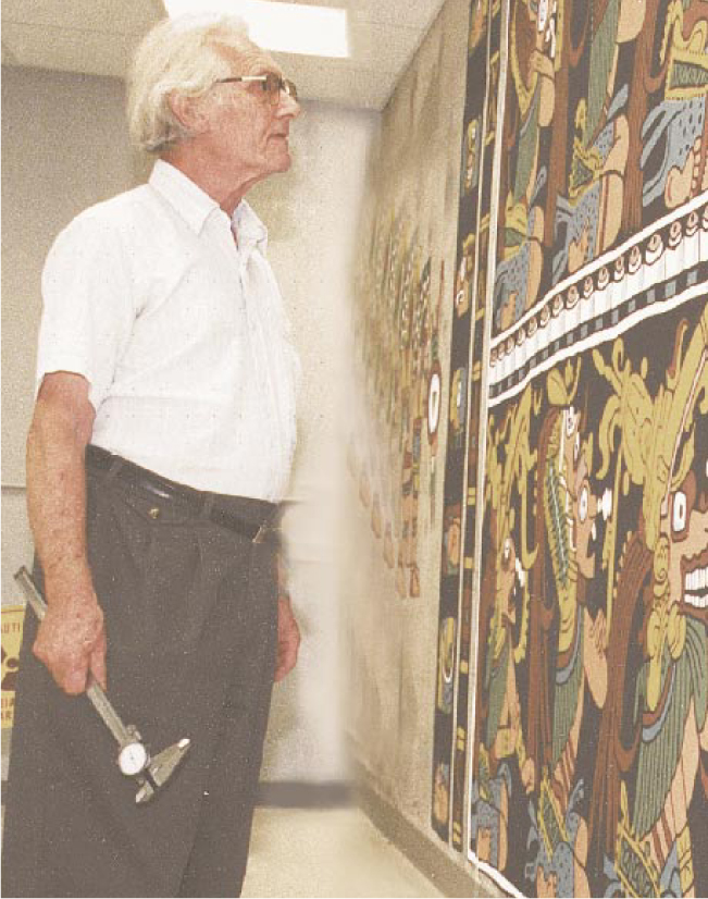 Kronenberg was also quite an artist. The photograph accompanying this obituary shows him standing in front of a 30-foot-wide by 9-foot-high mural that he painted on his concrete laboratory wall; he completed the work in February 2000. The mural depicts seven Mayan gods creating the universe. His inspiration was a vase found in the Mayan ruins, and the original painting was in black and white.