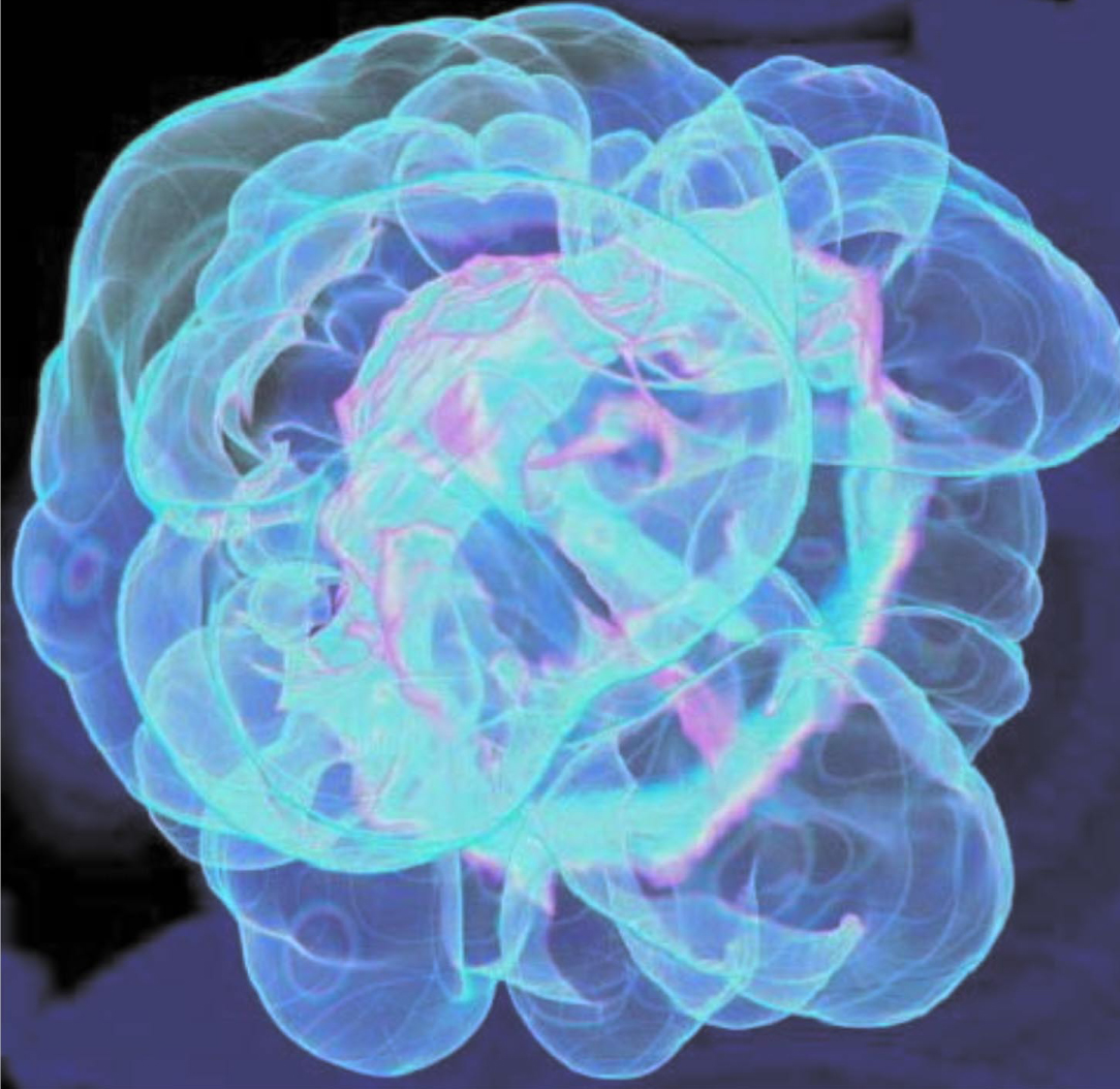 Computer simulation shows a bubble rising through a model star. The bubble was started in a slightly off-center position in a spherically symmetrical environment. This completely asymmetrical structure was a surprising outcome and has an important influence on the subsequent history of the star and its transition to supernova behavior. Another simulation (see Plewa et al., reference 1) shows that after the bubble surfaces, material flies over the star surface and dredges up material from the surface.