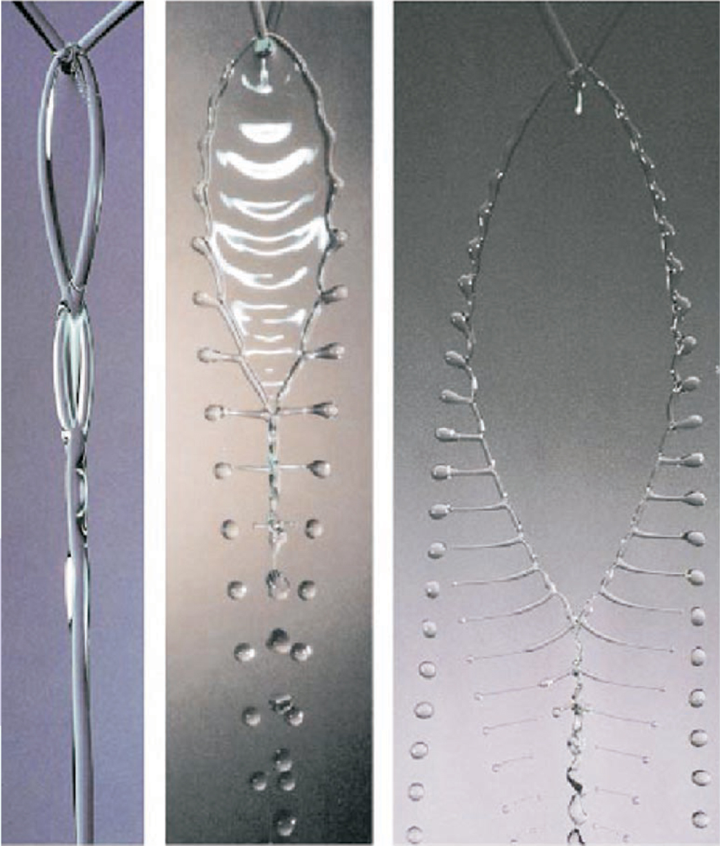 Figure 2. “Fluid fishbones” created by the collision of two jets at flow rates increasing from left to right.