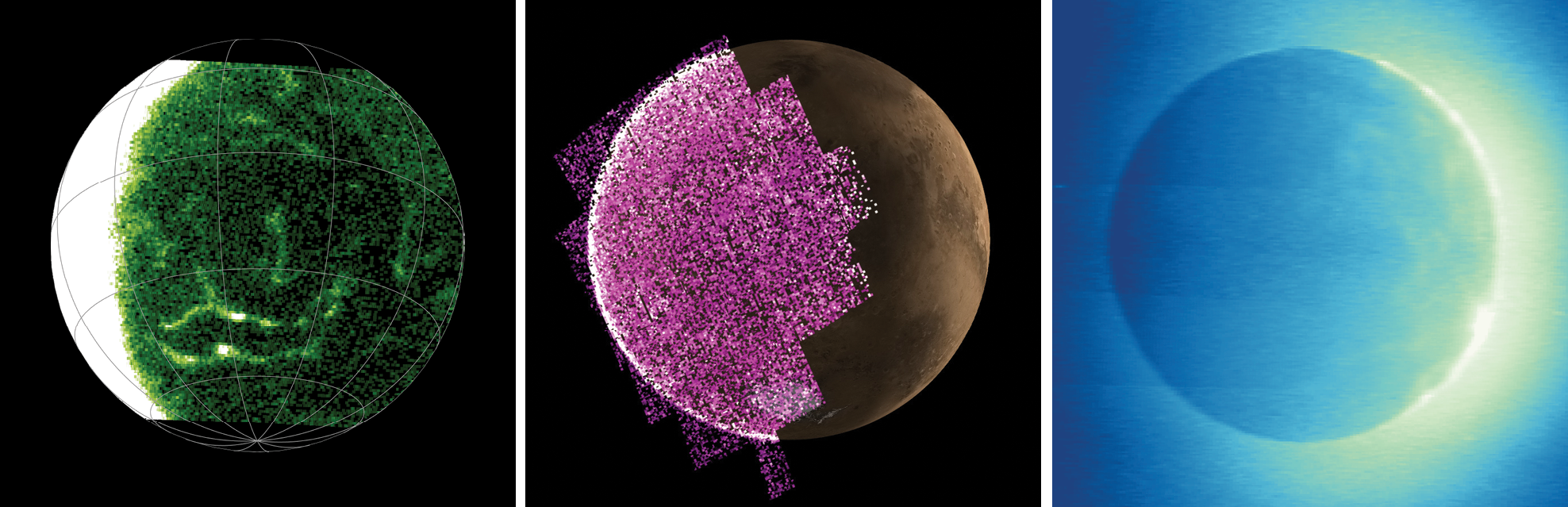 Three examples of Martian auroras, which are driven by mechanisms not found at Earth. (a) Confined auroral arcs after dusk are produced by electrons precipitating along magnetic field lines that emanate from concentrated mineral deposits in the planet’s crust. (b) Global diffuse auroras are produced by a solar energetic particle event. Their signature is a bright, thin ring around the nightside (left) edge of the disk. (c) A patchy proton aurora, caused by direct solar-wind precipitation when the magnetosphere is disrupted, is visible on the dayside (right). All images are false-color presentations of UV emission. (Panel a and c images from UAE Space Agency/EMM/EMUS. Panel b image from NASA/MAVEN/IUVS.)