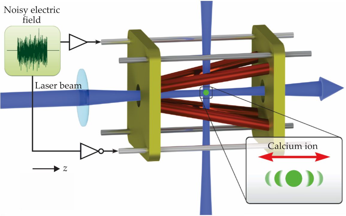 A single trapped ion (green) is confined in a conical ion trap with four RF electrodes (red) having a tapered geometry. The ion is alternately cooled (blue) and heated by noisy electric fields applied to outer electrodes (gray). The engine cycle is implemented in the radial directions, and the work produced after each cycle is stored in the axial (z) direction. The position of the ion, whose oscillatory motion acts like a flywheel, is imaged on a CCD camera. (Adapted from J. Roßnagel et al., Science 352, 325, 2016.)