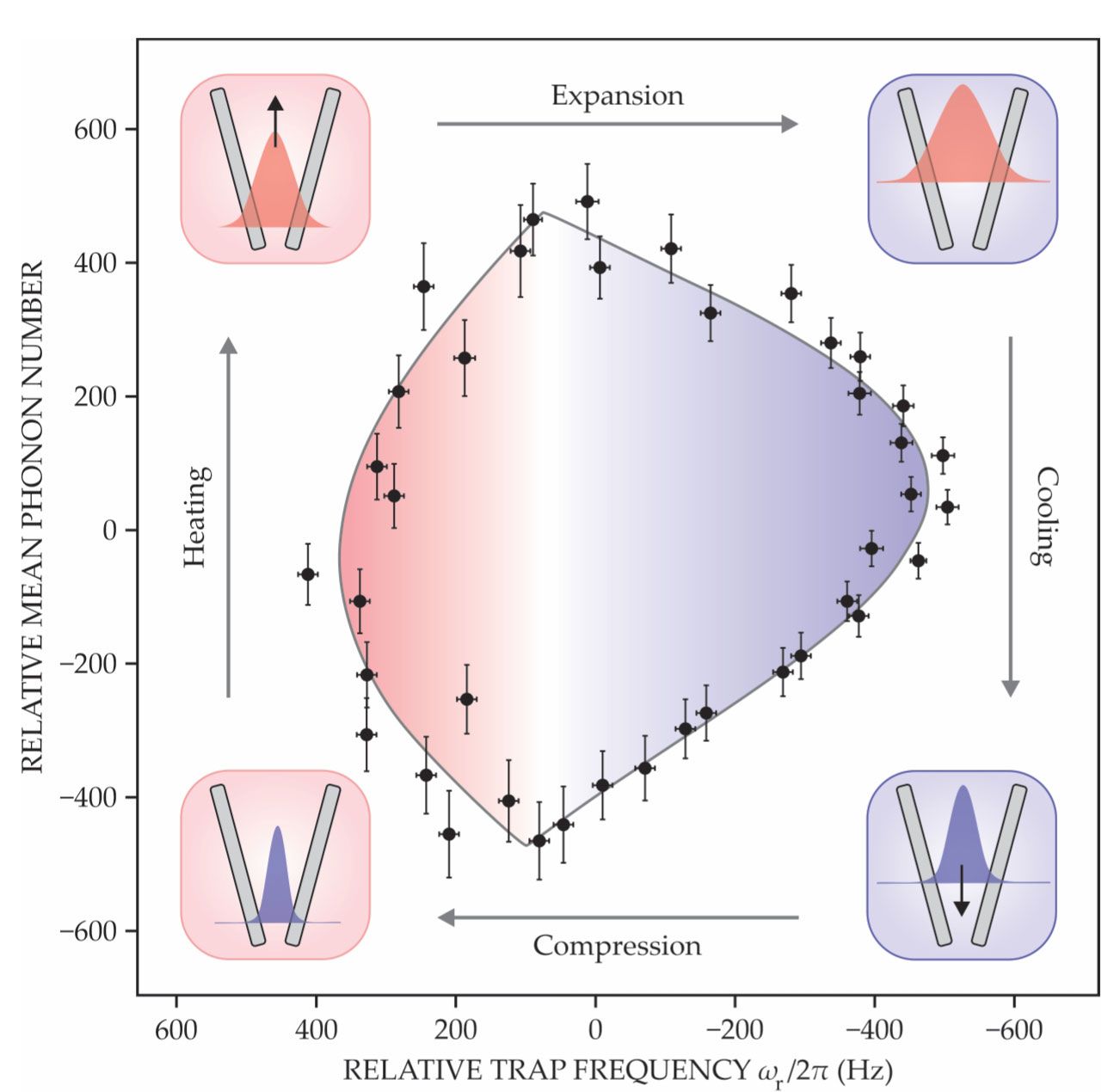 This thermodynamic cycle of the engine shows the mean occupation, or phonon, number of a 40Ca+ ion as a function of the (radial) trap frequency ωr of the harmonic trapping potential. The area inside the curve is proportional to the work produced during each cycle. The insets illustrate the four steps of the engine: compression, expansion, heating, and cooling. Blue corresponds to cooling and red to heating. (Adapted from J. Roßnagel et al., Science 352, 325, 2016.)