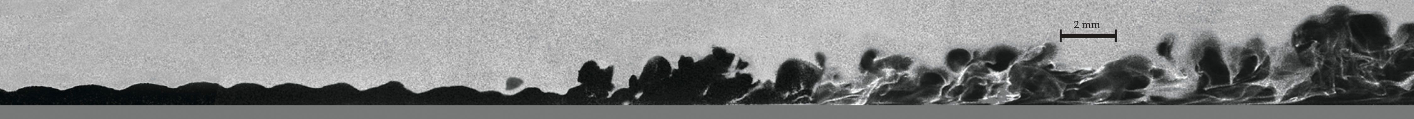 Rayleigh scattering reveals the transition from a laminar to a hypersonic boundary layer. Airflow is left to right in a Mach 6 air tunnel. The amplification of a high-frequency wave in the laminar region at left eventually results in the transition to surface turbulence at right. (Adapted from C. Lee, S. Chen, Natl. Sci. Rev. 6, 155, 2019, doi:10.1093/nsr/nwy052