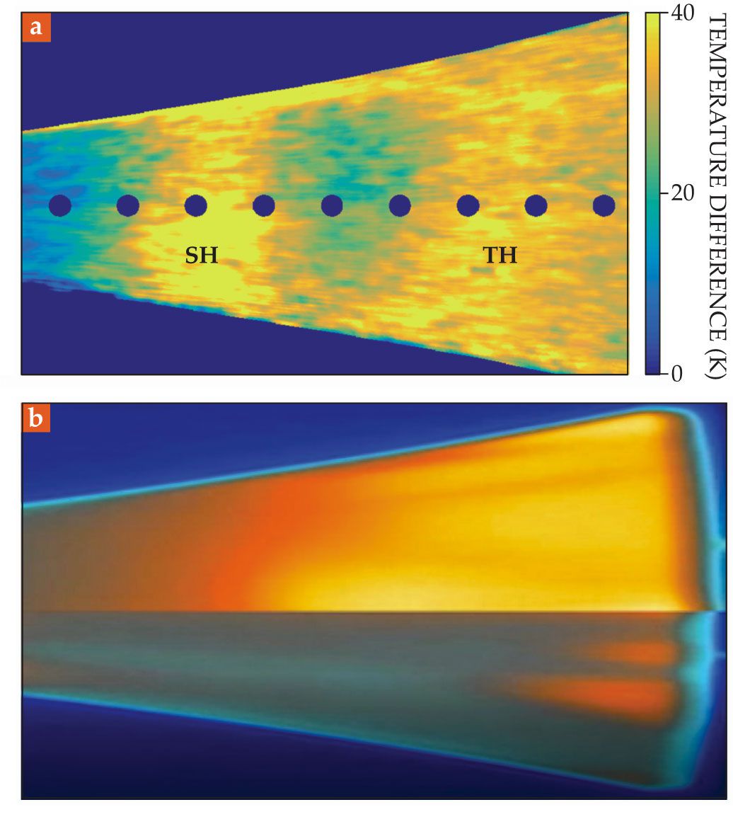 Figure 2. The surface temperature of a flared cone rises in a hypersonic wind tunnel whose air is flowing at Mach 6. (a) An IR camera captures two (yellow) hot spots: one (SH) that arises from air-compression effects, followed by a second (TH) that arises from turbulent shearing stresses, or turbulence-induced friction. The blue region between SH and TH is the result of cooling by air expansion. Blue dots on the cone signify flush-mounted pressure sensors. (Adapted from Y. Zhu et al., Phys. Fluids 30, 011701, 2018, doi:10.1017/jfm.2018.646