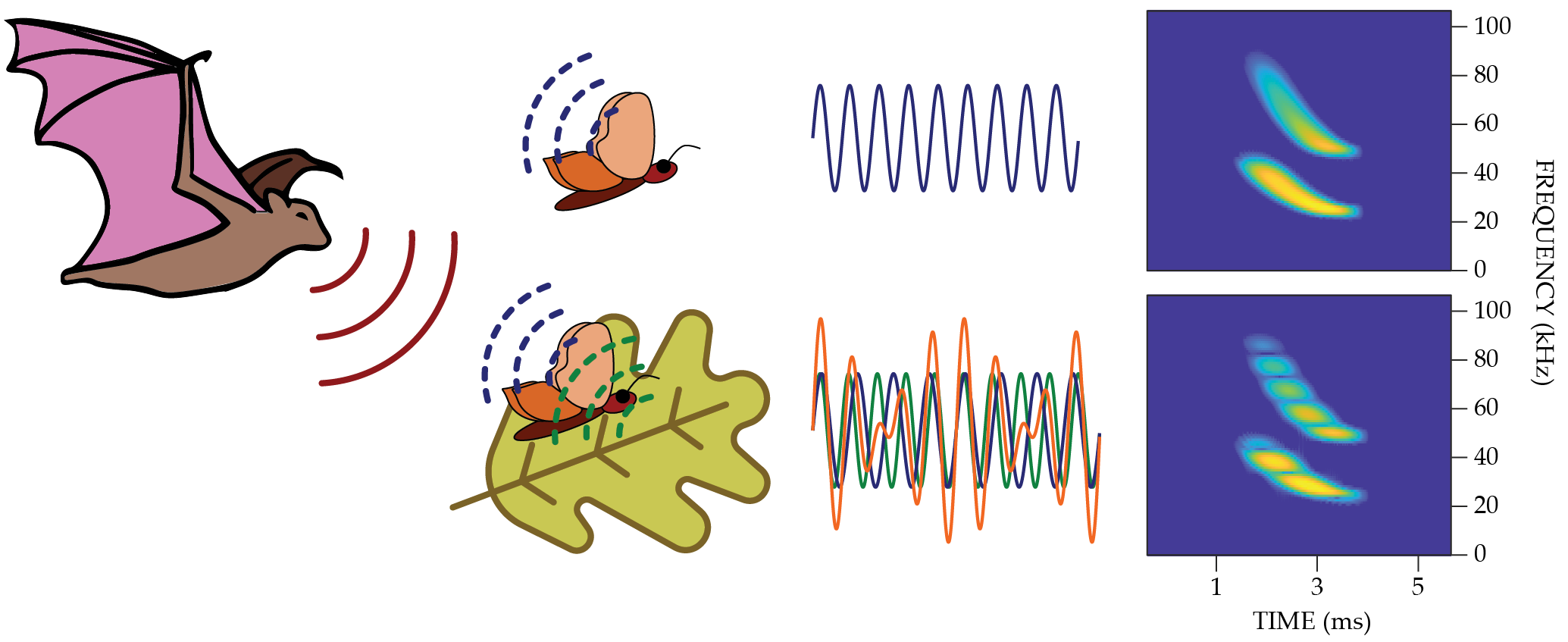 The interfering echoes produce spectral peaks in which discrete frequency bands are out of phase with each other. Those overlapping frequencies from two or more echoes cancel each other out and create a single sound with distinct gaps in frequency. The result is a single, composite echo that may not resemble what the bat recognizes as “leaf” or “dinner.” How bats translate the spectral profiles of composite echoes is central to understanding how bats perceive target shape.
