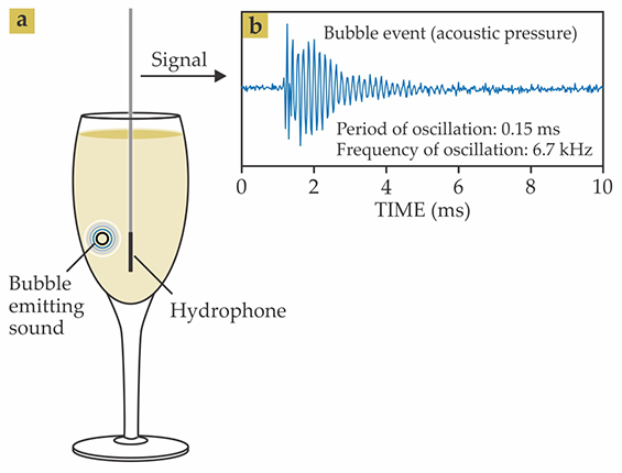 A ringing bubble. A hydrophone (a) placed into a flute of sparkling wine records the sound a bubble makes as it breaks free of the glass and rises. (b) The audio signal is a short tone burst at the natural frequency of the bubble, which is inversely proportional to the bubble diameter.