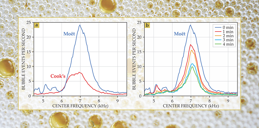 Popular lore has it that the quality of a sparkling wine can be determined by the characteristics of its bubbles. As the saying goes, “The smaller the bubbles, the better the wine.” Regardless of whether that statement is true, it seems uncontroversial to say that the enjoyment of sparkling wine is closely connected to the presence of its bubbles, and certainly the physics and chemistry of bubble formation in sparkling wines have been studied for at least the past two decades. In this Quick Study, we describe some work we did to find out if passive acoustic monitoring—listening to the sounds that the bubbles make as they form and rise in the wine—can be used to extract quantitative information about the bubbles. Passive acoustic monitoring has been applied to other systems involving bubbles—for example, to detect underwater leaks from gas pipes and methane hydrate deposits at the seafloor or to analyze the sizzling sounds, indicative of ice melt, made by trapped bubbles escaping from pockets in submarine glacier ice.