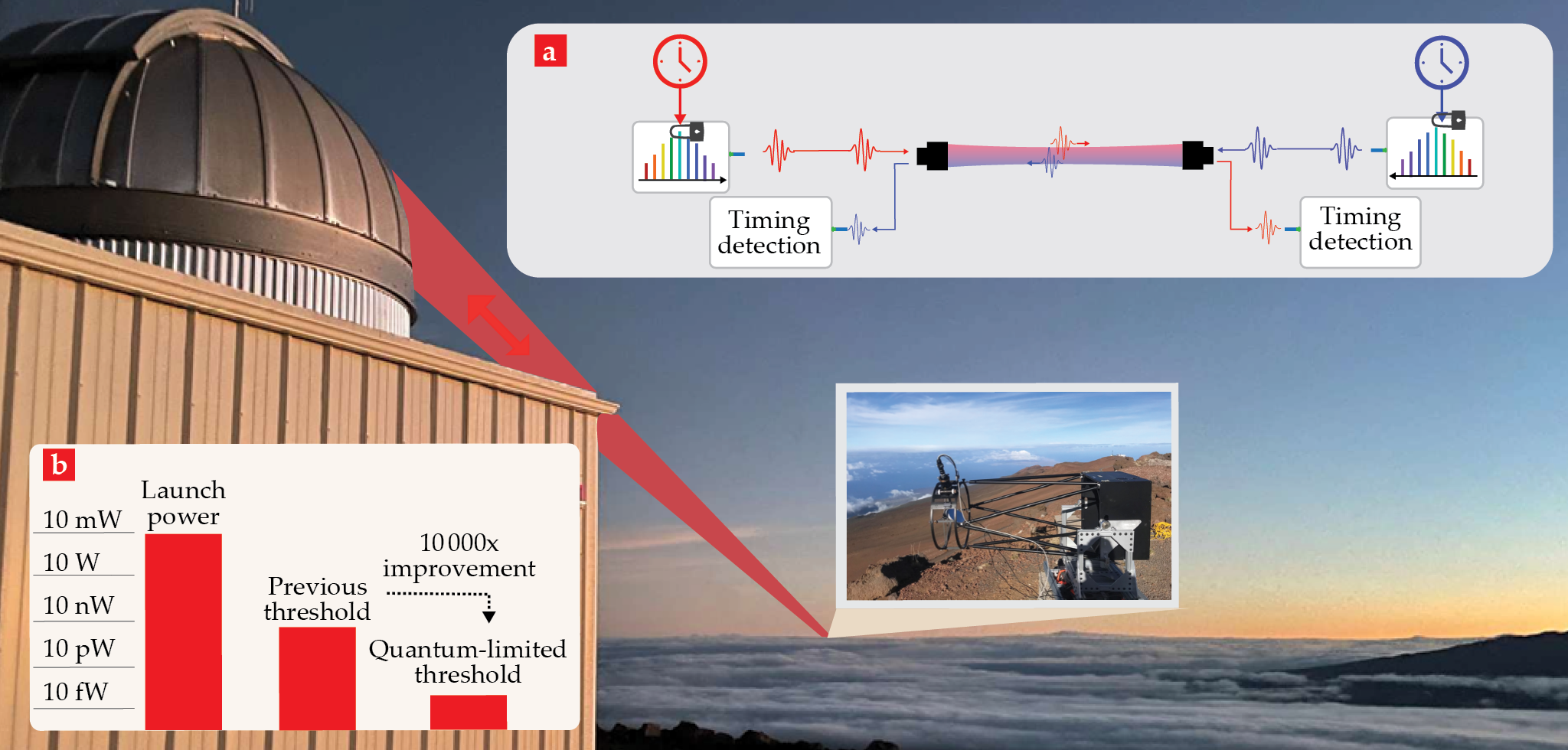 The Mauna Loa Observatory (foreground) on the island of Hawaii sends a laser pulse as part of an optical time-transfer demonstration over the 300 km round-trip distance between it and a cat’s-eye retroreflector (inset) on Maui. (a) A frequency comb referenced to a stable laser sends its pulses to the other clock’s site over a bidirectional free-space link. Combining the pulses at each site yields the timing offset between the two clocks. (b) Time-programmable frequency combs enable quantum-limited timing detection, which reduces the power required for time transfer by 10 000. (Adapted from E. D. Caldwell et al., Nature 618, 721, 2023.)