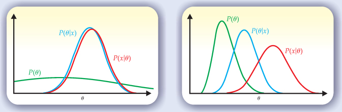 The left-hand side of the theorem gives the posterior probability for θ, that is, the probability for θ deduced after seeing the outcome of the measurement x. Bayes’s theorem tells experimenters how to learn from their measurements; the figure presents a couple of graphical examples. But the learning requires an input: a prior degree of belief about the hypothesis, P(θ). Bayesian analysis provides no golden rule for prior probabilities; they might be based on previous measurements, symmetry arguments, or physical intuition. But once they are given, Bayes’s theorem specifies uniquely how those probabilities should change in light of the data.