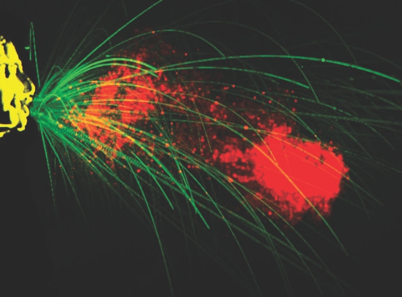 Violent exhalations such as a sneeze release a turbulent cloud of hot, moist air and suspended droplets (red) that can travel the length of most rooms (up to 8 m). The cloud and its payload of saliva and mucus droplets can also linger in the air for as long as 10 minutes. The largest of such drops (green) shoot from the mouth and fall quickly. The gas-phase dynamics enhances the range of suspended droplets by delaying their exit from the cloud. (Image courtesy of Lydia Bourouiba, MIT, from HHMI’s Image of the Week: The Anatomy of a Sneeze.)