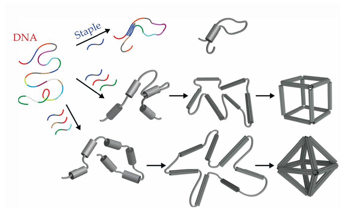 Single strands of DNA, left, bond to shorter DNA strands called staples in regions for which their nucleic-acid sequences are complementary (indicated by matching colors). The bonded regions fold the strand and form double helixes, indicated by the gray cylinders. With the right combination of staples, the double helixes bundle together and form a prescribed shape, such as a cube, shown at right. (Image by Oleg Gang.)