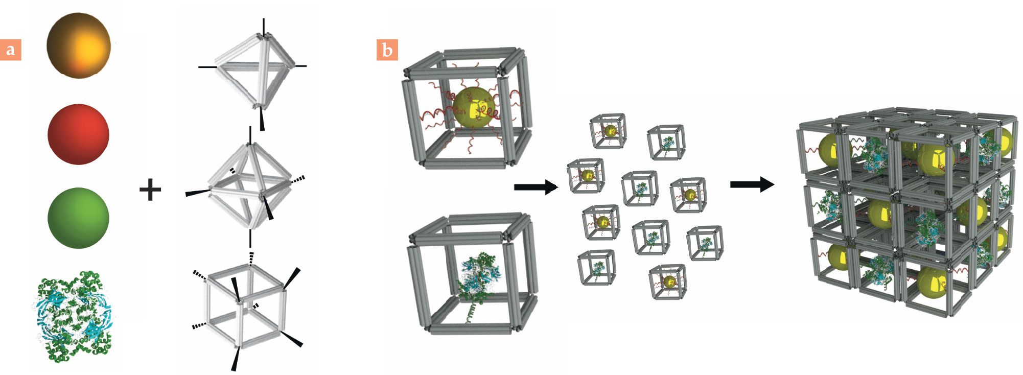 Self-assembly guided by DNA starts with a so-called voxel composed of (a) a nano-object—that is, one of the different types of nanoparticles (colored spheres) or biomolecules on the left—loaded into one of the DNA-origami frames on the right. (Adapted from Y. Tian et al., Nat. Mater. 19, 789, 2020.) (b) The voxels (left) assemble into a lattice (right) as prescribed by DNA coding at each frame’s vertices. The lattice’s shape and symmetry are independent of the properties of the nano-object in the voxel. (Image by Oleg Gang.)