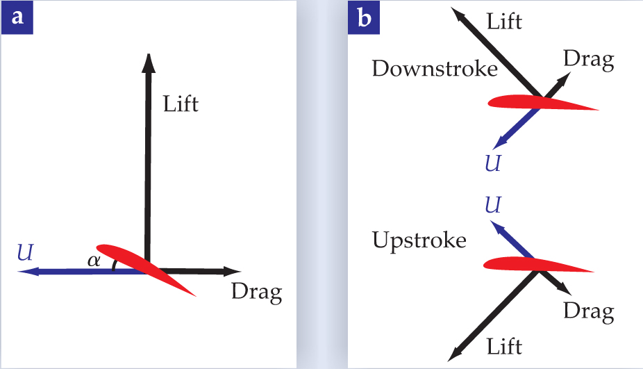 Figure 1. Aerodynamic lift and drag. Lift is the force component orthogonal to the wing velocity U, and drag is the component opposite to the velocity. (a) For an airplane with a small angle of attack α, the lift is upward and the drag is rearward. (b) A wing flapping up and down can fly into a headwind. In both the upward and downward strokes, the lift has a forward component that provides thrust.