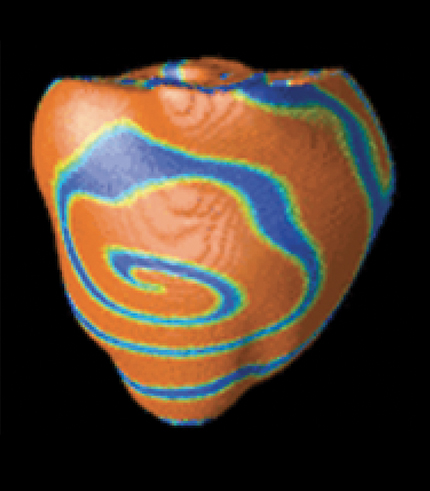 Figure 1. In the heart, spiral waves of peak electrical activity (orange in the dramatized simulation pictured here) can lead to high heart rates or, if they break up, to fatal uncoordinated contractions.