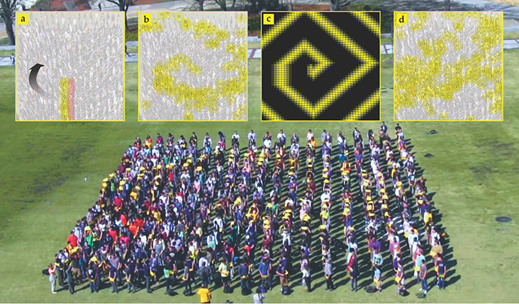 Figure 2. At an Atlanta Science Festival outreach activity (background photo), people formed a spiral wave. (a) To ensure clockwise propagation of the wave, a line of volunteers (holding up square sheets and highlighted in yellow) began the exercise in the excited state with arms raised while their neighbors to the right (pink) were in the refractory state—unable to be excited for a specified period. (b) The people holding up sheets (yellow) display the characteristic shape of a spiral wave. (c) When a computer simulation rigorously follows the rules given to festival participants, the resulting wave (yellow) is much sharper. (d) Some human spiral waves persist, but others become disordered as indicated by the highlighted individuals with raised sheets.