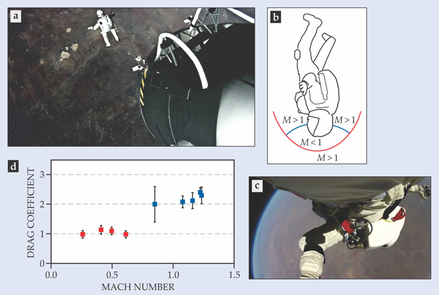 About 25 seconds into his jump, Baumgartner entered the transonic regime and achieved the head-low positioning, shown in panel c of the figure, that minimizes A and hence the drag force. For a significant time, his skydiving skills allowed him to maintain a constant-A, head-low stance without dramatic maneuvering, though he did rotate slightly about a vertical axis. For five short, but not too short, intervals of time, Baumgartner’s motion was steady enough that we could determine A (0.25 m2, chest pack and chute bag included) and extract CD as a function of speed in the transonic regime. Panel d of the figure shows the results, which ranged from 2.0 to 2.4. The highest values of CD correspond to speeds very close to Baumgartner’s record maximum of Mach 1.25. It is possible that at higher transonic speeds, CD would further increase. Indeed, many experiments on streamlined and blunt bodies have shown a maximum drag at speeds much greater than Mach 1.