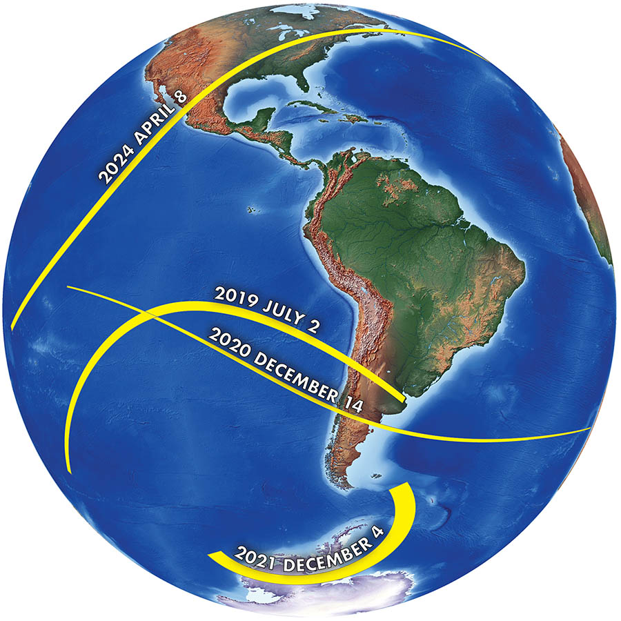 Figure 1. Map of total solar eclipses, 2019–24. Only within the narrow path of totality can the corona be seen by the unaided eye. During annular eclipses or partial phases close to totality, even the few percent of the photosphere that remains visible brightens the sky enough to hide the corona. The 2023 path of totality is not shown. (Courtesy of Michael Zeiler, www.eclipse-maps.com