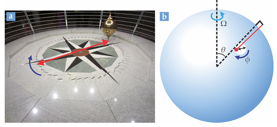 Figure 1. Rotating oscillation planes. The majestic Foucault pendulum (a) at the California Academy of Sciences knocks down pillars as its direction of oscillation (red double-headed arrow) rotates clockwise (blue arrow). (Photograph by Another Believer.) (b) This obviously not-to-scale sketch of a Foucault pendulum defines the parameters