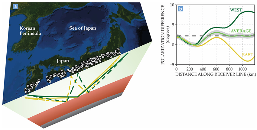 Figure 2. Measuring a rotating polarization. To determine the Coriolis-force-induced rotation of seismic-wave polarization, (a) we used the stations of Japan’s High Sensitivity Seismograph Network that are marked by the small squares. The yellow lines indicate the eastward-propagating trajectory of seismic waves generated by an earthquake near the west end of the array: The solid line is a trajectory of an ScS wave that bounces once off the core–mantle boundary and the dashed line is an ScS2 trajectory that bounces twice. Green lines signify the westward-propagating seismic waves created by an earthquake near the eastern part of the array. (b) Shown here is the measured difference in polarization between ScS and ScS2 waves for the eastward-moving (yellow) and westward-moving (green) trajectories described above. The light green curve is the average of the two trajectories; for a long distance along the receiver line, that average reveals the effect of the Coriolis force. The gray band shows our error estimate and the dashed line indicates the theoretical prediction for the long-distance average.
