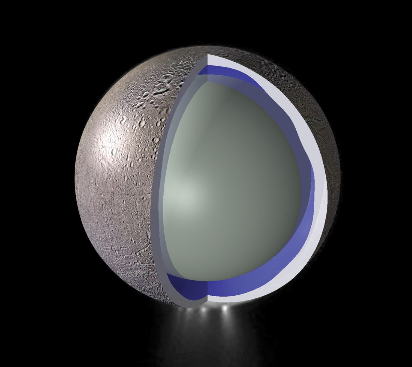 Enceladus in cross section. In addition to the craters that scar its icy surface, Enceladus contains smooth plains and cracks, ridges, and fissures. The moon’s interior is composed of an ice shell (white), whose thickness is roughly 20 km on average but thins at the south pole, as modeled from gravity measurements. Below that shell is an ocean (blue) that covers a rocky interior (gray). (Courtesy of Doug Hemingway.)