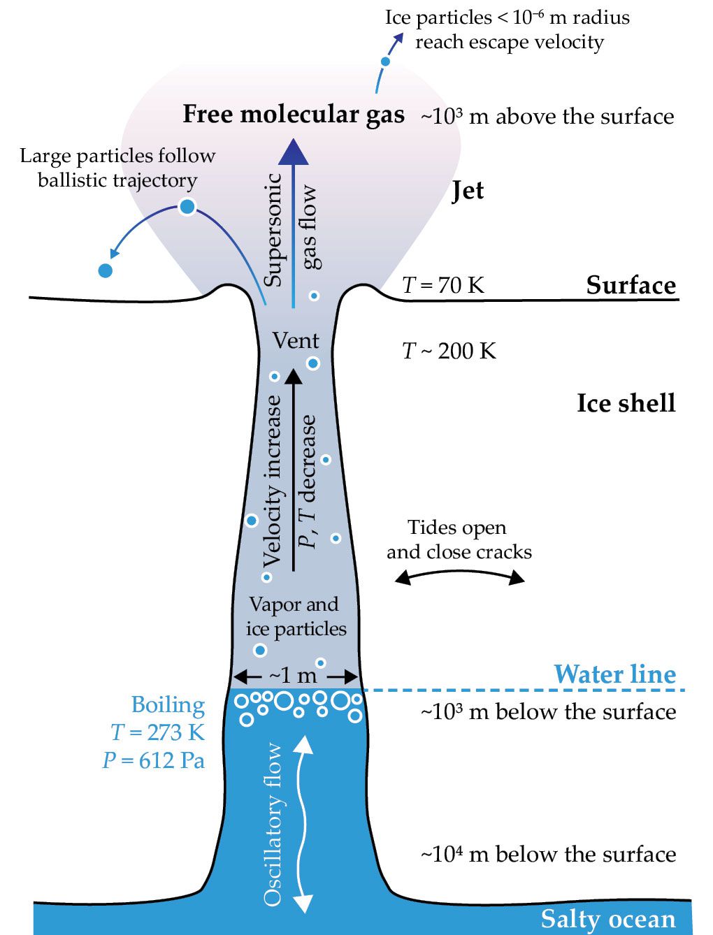 Shell dynamics. This schematic (not to scale) illustrates some of the main processes that occur inside the ice shell and its fissures. The eruptions are assumed to originate from water in an ocean under the shell, although any liquid-water source, such as a melt reservoir in the icy crust, should produce similar dynamics. As Enceladus’s tidal forces open and close a crack in the fissure, water flows into (and recedes from) the fissure. The velocities of ascending vapor and ice particles increase in the vent as pressures and temperatures drop. Above the vent, they reach supersonic speed.