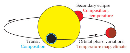 Figure 1. Three techniques for studying the properties of exoplanet atmospheres. When a planet passes in front of its host star, the wavelength dependence of the fraction of starlight absorbed gives information about atmospheric composition. When the planet passes behind the star, the decrease in IR light gives information about composition and temperature. Variations in the IR brightness of the planet as it revolves around the star reveal the day–night temperature difference. (Adapted from D. Deming, S. Seager, Nature462, 301, 2009.)