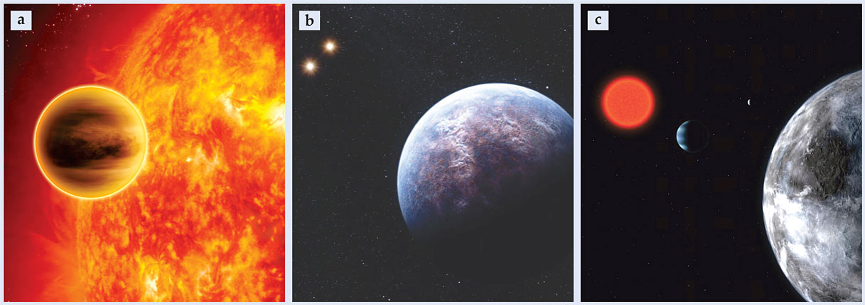 Figure 2. Exoplanets in artists’ renditions. (a) The gas giant HD 189733b (courtesy of the European Space Agency). (b) Gliese 667 Cb (courtesy of the European Southern Observatory). This super-Earth is smaller than a gas giant like Jupiter. (c) The planetary system orbiting the red dwarf Gliese 581 (courtesy of ESO). Planets orbiting cool, low-mass stars like Gliese 581 are the best targets of study for detailed characterization of Earth-like exoplanets.