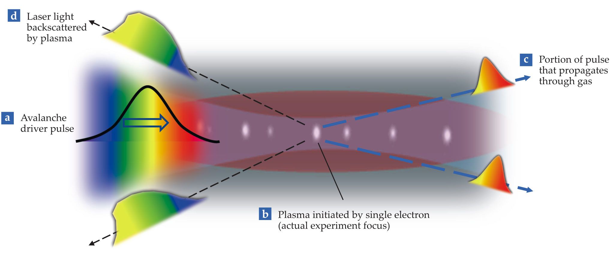 A laser emits a short chirped pulse through air. (a) The red part of its spectrum precedes the blue. (b) Light at the laser’s focus produces a plasma blob initiated by a single electron. The series of blobs pictured are experimental data. (c) Beyond the focus, a portion of the driver pulse—the early (red) part of the spectrum—continues propagating. (d) Another portion of the pulse is backscattered by the plasma. That spectrum is the main diagnostic and is collected by a spectrometer.