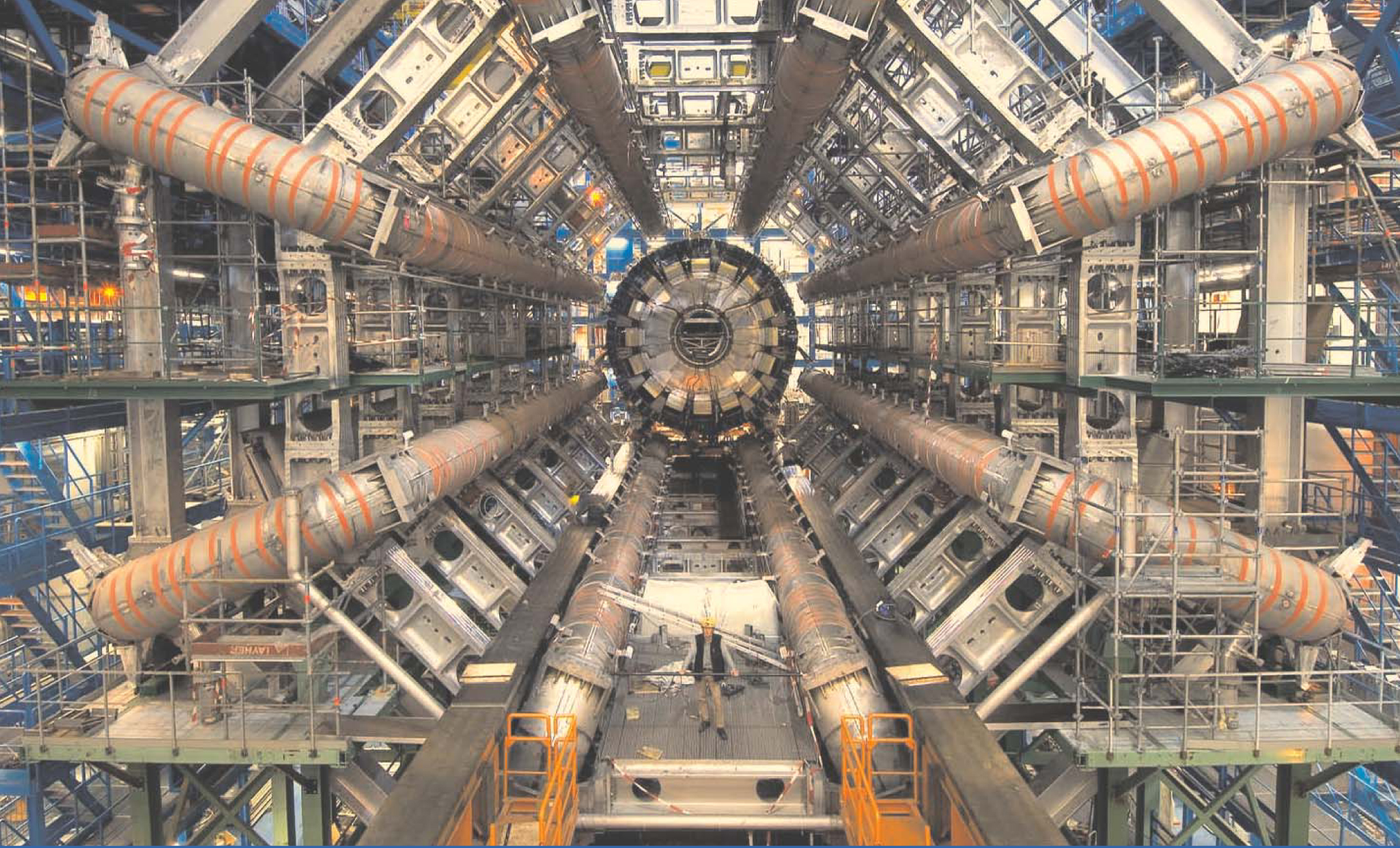 The ATLAS underground cavern, photographed in October 2005. The round calorimeter in the center is surrounded by eight toroidal superconducting coils.