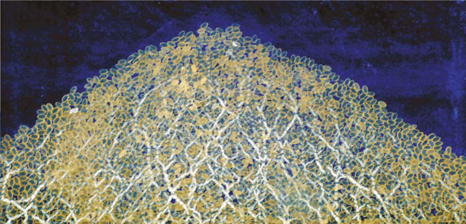 Knowledge of contact roughness provides only limited information about contact forces. Insight about those forces, however, has emerged from ingenious experiments that use photoelastic techniques to literally illuminate both the normal and tangential components of granular contact forces in two-dimensional systems. The earliest practitioners of the technique were Takao Wakabayashi in 1950 and Pierre Dantu in 1957. As seen in figure 1, running through the photoelastic disks are illuminated force chains, quasi-linear groups of particles with above-average stress that support granular structures. Far more subtle is the role of the surrounding weaker chains that appear almost ghostlike in the image. Theoretical modeling has revealed that the ghost chains also help support the overall stability of the structure. The seemingly innocuous ghosts might also turn out to be forbidden fruit, not to be touched lest disaster ensue.