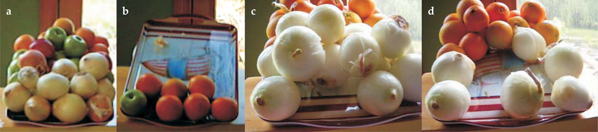 Figure 2. Unpeeled onions (a) provide a weak foundation for the apples and oranges higher up in a tilted fruit tray. After removal of just one onion from the base, almost all the fruits fall off (b). A pile whose base is made of peeled onions is difficult to collapse, an effect directly attributable to friction. Pile is shown after removal of one (c) and six (d) onions.
