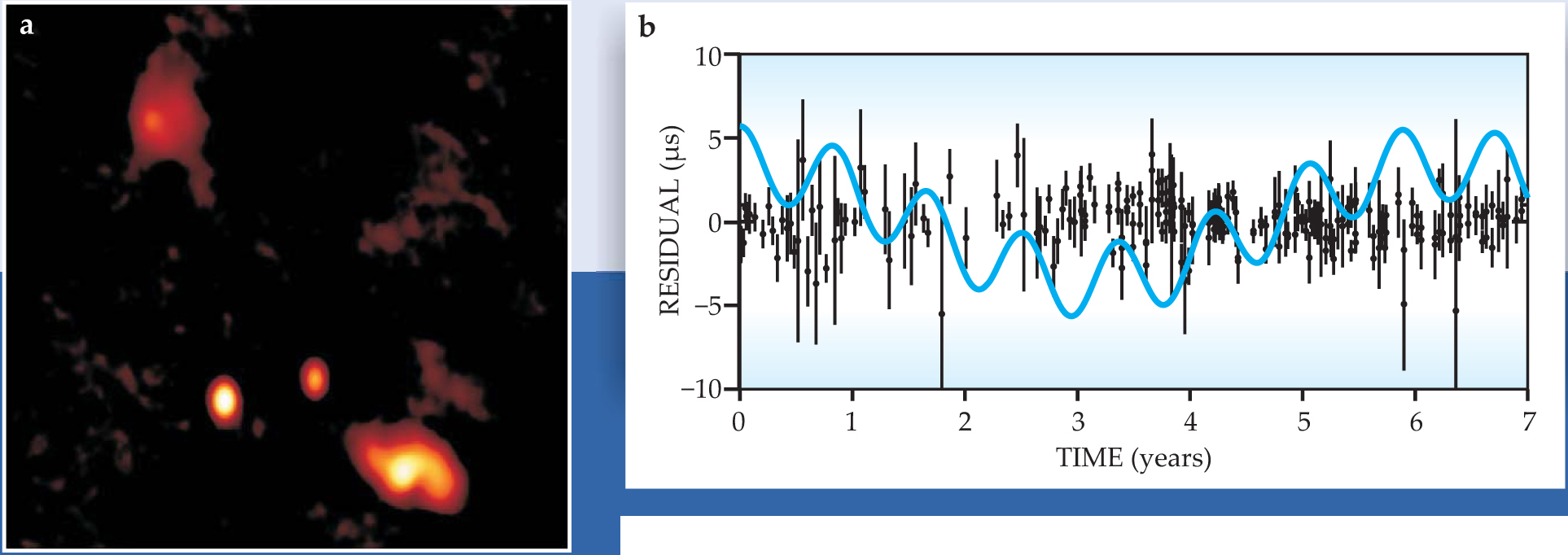 Sources and signals of gravitational waves. (a) The central region of the galaxy B0402+379, as observed by the Very Long Baseline Array. The two bright, compact features toward the bottom center of the image likely represent two supermassive black holes in orbit about each other. The other emission, below and to the right of the SMBHs, is due to jets of plasma expelled from the environments of the SMBHs.(b) Even absent gravitational waves, the timing of pulsar signals will not agree perfectly with models. The solid points with error bars here show the timing differences (residuals) for the millisecond pulsar PSR B1855+09. The blue line shows the expected residuals that would arise if PSR B1855+09 were influenced by gravitational-wave emission from a nearby SMBH.