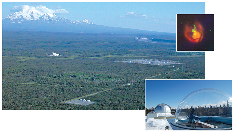 Heating and observing the ionosphere. Generators at the High Frequency Active Auroral Research Program (HAARP) operations center in Alaska (buildings to the upper left) feed power to the large antenna array to the right. That array, in turn, transmits RF waves that interact with the ionosphere. Shelters down the road from the array house optical instruments for observing the resulting excitations; one of the instruments is visible through the clear dome in the lower inset. (Backdrop photo by A. Lee Snyder; inset photo by Robert Esposito.) The red and green regions in the upper inset (courtesy of Jeffrey Holmes) represent regions of the ionosphere in which oxygen atoms excited by ionospheric heating relax to lower-energy states. Behind the HAARP site rises Mount Drum.