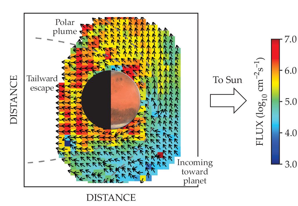 A year’s worth of data on oxygen escaping from Mars. Colors represent the flux of oxygen atoms, and arrows show the average direction of their movement. (Adapted from an image courtesy of the American Geophysical Union.)