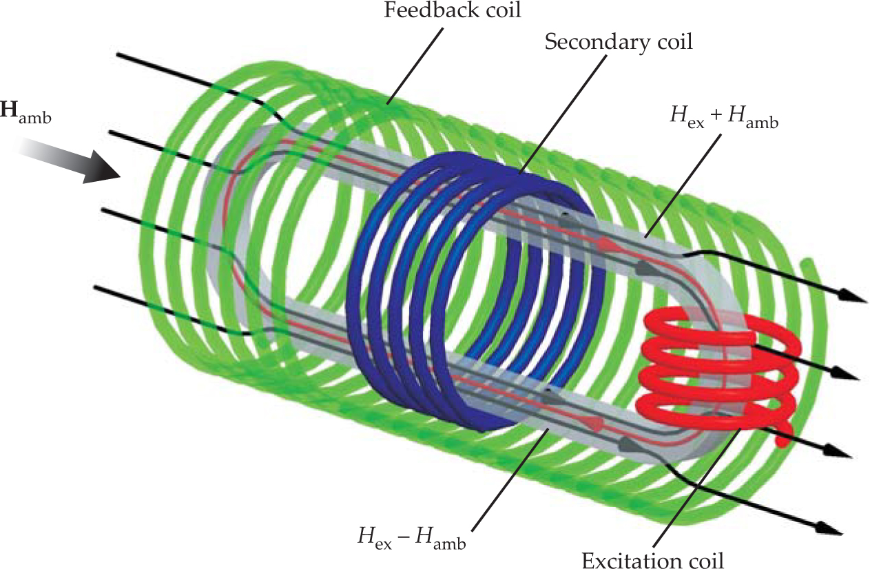 The field measurement can be realized as a current measurement. A feedback coil compensates the ambient field at the core position; the required current is proportional to the magnitude of the field.