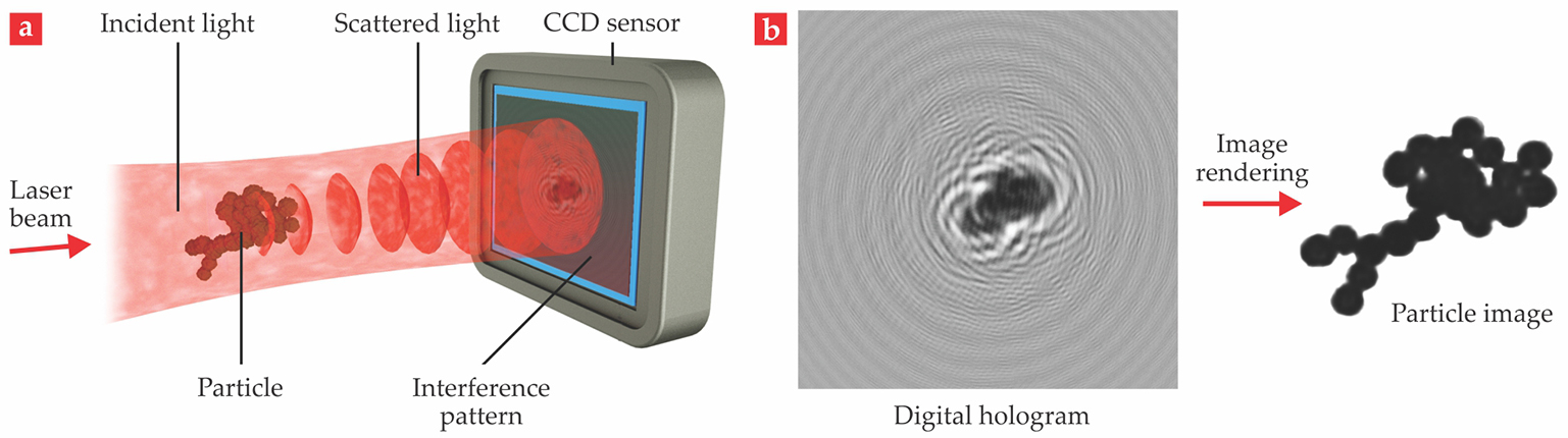 To form a digital hologram of a particle, (a) the interference pattern of scattered and unscattered light is registered by a CCD sensor. (b) Computer-assisted analysis of the hologram renders a silhouette-like image of the irregularly shaped particle.