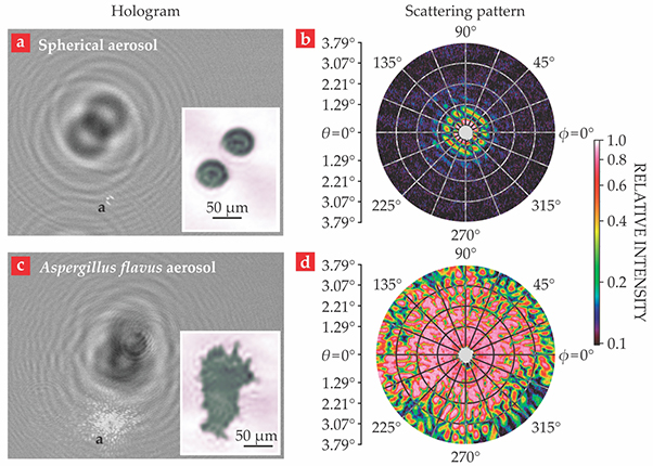 Rather than confront the inverse problem head on, we simultaneously measure a particle’s scattering pattern while imaging it with digital holography. (a) A pair of spherically shaped 50-μm-diameter silicon dioxide particles generated the digital hologram shown here. The insert shows the particle image rendered from the hologram. (b) In this SiO2 scattering pattern, θ denotes the polar, scattering angle and ϕ is the azimuthal angle. Light is incident on the particles from the z-direction, perpendicular to the page. Color gives relative intensity. (c, d) An aerosol particle of the fungus Aspergillus flavus yields a more complex hologram and a much more complex scattering pattern. The features labeled “a” in the holograms are measurement artifacts. They arise because green light, which is resolved in the sensor’s green channel to give the scattering pattern, can leak into the sensor’s red, hologram-determining channel.