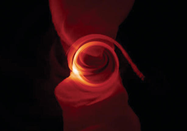 The black hole at the center of the Milky Way radiates as it accretes hot plasma. This three-dimensional simulation of 1.3 mm radiation shows the circular shadow cast by the black hole. The shadow is not fully dark because some radiation is emitted between the black hole and the viewer. (Courtesy of Chi-kwan Chan/University of Arizona.)