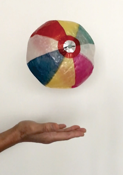 Figure 1. Bouncing a kamifusen. The balloon’s hole is visible in the silver patch where the tapered ends of the different-colored wedge-shaped paper converge.