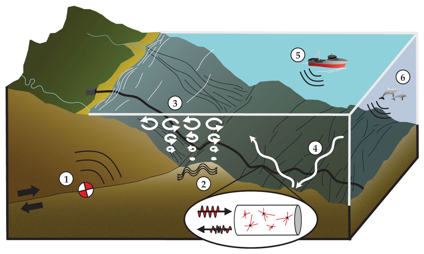 Distributed acoustic sensing (DAS) takes advantage of a fiber-optic cable’s small, inherent defects, which light encounters when propagating through the cable. Some of that light scatters back along the fiber, and its travel time is a proxy for the deformation, or strain, of the fiber over time. The geophysical and environmental phenomena that may be observed by an ocean-bottom DAS array (black cable) include (1) earthquakes and (2) ambient seismic noise from ocean–solid Earth interactions; oceanographic signals, such as (3) surface gravity waves and (4) internal gravity waves; and acoustic signals from (5) shipping traffic and (6) marine mammals.