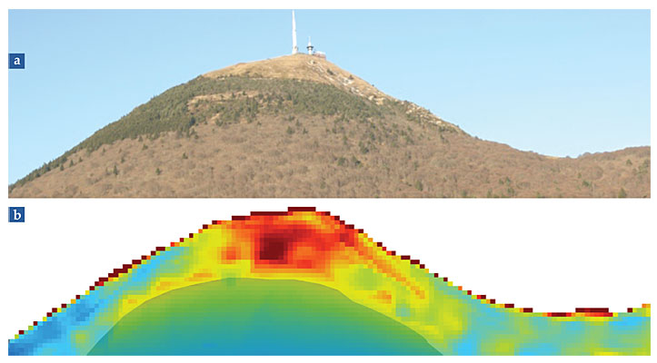 Images of Puy de Dôme, located in the Massif Central region in south-central France. (a) This photograph of the dormant volcano’s summit shows a section about 400 m high. (b) The muon opacity shown here (red is most opaque; blue, least), from the Tomuvol collaboration’s preliminary radiography measurements, is closely related to the density of volcanic material. A dense core is clearly visible in the upper part of the cone. The featureless region at the bottom of the cone was inaccessible to Tomuvol’s small detector.