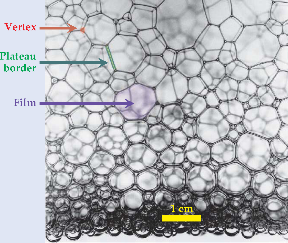 Figure 1. Foam structures. This photograph, taken 30 minutes after a detergent solution was shaken, shows several elements of foam geometry. The films toward the top, where the foam is dry, intersect at so-called Plateau borders that in turn intersect at vertices. Dry foams are made of polyhedral bubbles; wet foams, as seen near the bottom, have rounder bubbles because liquid has inflated the Plateau borders and vertices.