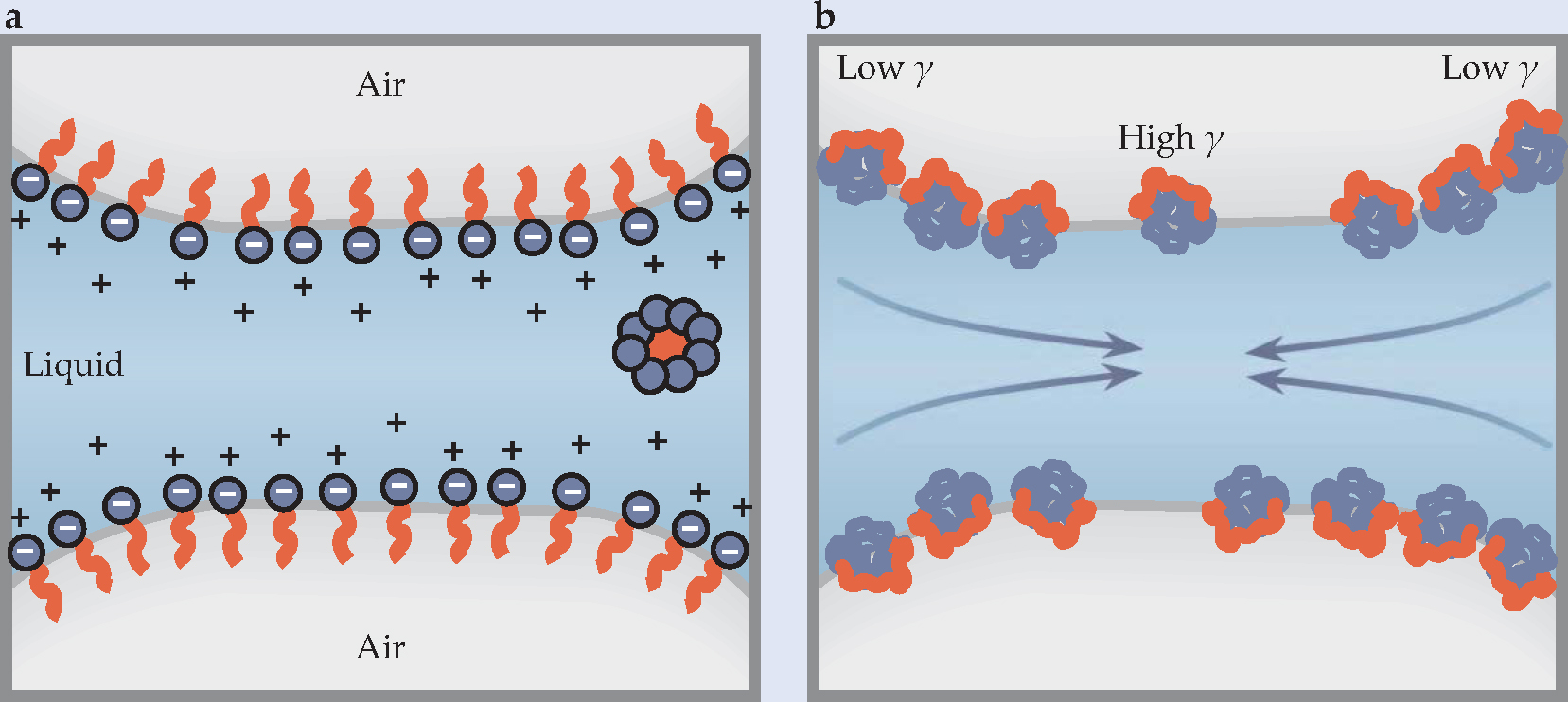 Figure 2. Stability mechanisms. (a) Adsorbed ionic surfactants and their associated electrostatic repulsions stabilize detergent films. The hydrophobic tails of the surfactants (red) are shielded from water, for both the adsorbed surfactants and those aggregated into micelles, where they are surrounded by hydrophilic heads (blue). (b) Beer films are stabilized by adsorbed proteins and the resulting Gibbs-Marangoni effect, which causes the flow from low to high surface tension (γ) indicated by the arrows. As with surfactants, proteins have hydrophilic (blue) and hydrophobic (red) parts.
