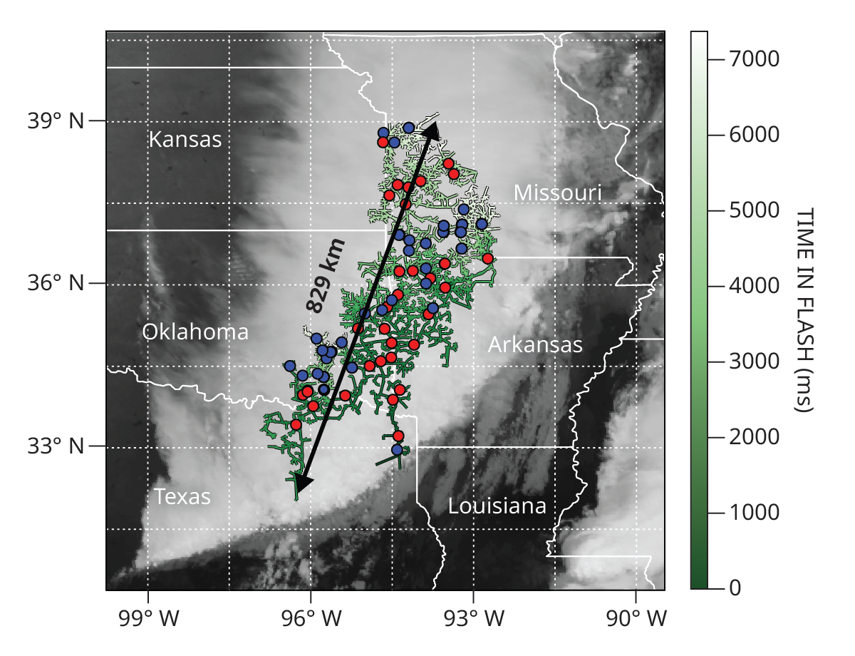 The world record for the largest megaflash lightning (green), certified by the World Meteorological Organization, struck the central US on 22 October 2017. The megaflash data shown here comes from composite GOES-16 satellite imagery. Also shown are 116 associated cloud-to-ground discharges: 83 negative strokes (blue) and 33 positive strokes (red).