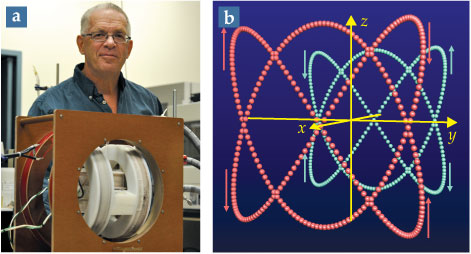 In our lab, the two of us use magnetism to make fluids flow, often in striking ways. Such noncontact flow eliminates the need for motors and impellers and the seals they employ. To create our magnetic fields, we combine two or three mutually orthogonal components, no more than one of which is constant, or DC. Figure 1a shows the device that generates the fields; it includes three mutually orthogonal pairs of nested Helmholtz coils. Running current through any Helmholtz pair generates within it an essentially uniform magnetic field parallel to its cylindrical symmetry axis. The two or three oscillating, or AC, components have frequency ratios that form simple rational numbers. A typical field might have one constant component and two oscillating components with frequencies of 200 Hz and 300 Hz. Figure 1b shows how that example field evolves in time.