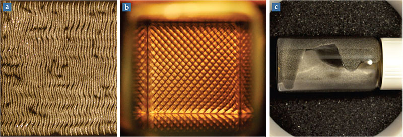 Subjecting a suspension of magnetic platelets to a particular biaxial AC field produces the striking flow lattice shown in figure 2a, in which the columns are normal to the field and the flow along any given column is opposite to the flow in the neighboring columns. Unlike natural convection, this surprising “isothermal magnetic advection” requires neither a thermal gradient nor gravity, so it could be useful for heat and mass transfer in space. It is an emergent behavior—like the flocking behavior in a murmuration of starlings—that arises because the dynamic field induces torques and moments on individual platelets that couple to other particles. Stranger still is the configuration shown in figure 2b, a checkerboard lattice of counterrotating vortices. Such structures emerge when the platelet suspension is subjected to a triaxial field, such as shown in figure 1b, comprising a biaxial AC field and a single DC component.
