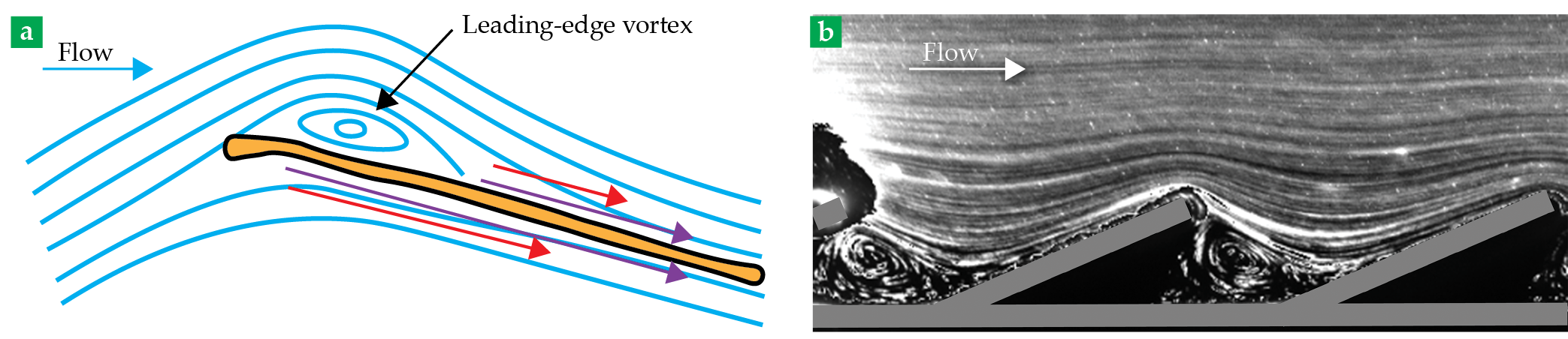 Streamline patterns. (a) As air flows over a butterfly’s wing during flight, a leading-edge vortex forms on the upper surface. As the viscous air travels across the wing, it generates skin friction, which creates drag (red arrows) on both sides of the wing. Without the so-called roller-bearing effect created by the wing’s scales, the drag would be greater (purple arrows). (b) In a fluid visualization experiment employing mineral oil, the tiny cavities between scales (gray bars) trap fluid, which then rotates in small vortices. As if sliding across roller bearings, the outer air flows over the surface with less skin friction. (Adapted from S. Gautam, PhD thesis, U. Alabama, 2021.)