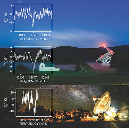 Figure 2. Spectra of propylene oxide. The two upper spectra were observed with the Robert C. Byrd Green Bank Telescope, shown in the background. The lower spectrum was taken with the Parkes telescope, again shown in the background. The specific definition of the background-subtracted temperature TA∗ is not essential here; the key point is that negative values represent absorption of light and positive values signify emission above background values. (Green Bank Telescope photo courtesy of Brett McGuire; Parkes telescope photo courtesy of CSIRO.)